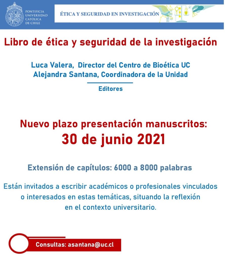 Te invitamos a incluir estas experiencias y postular para que este material sea parte del primer libro de la Unidad de Ética y Seguridad en Investigación junto al Centro de Bioética. La extensión de los capítulos es entre 6.000 a 8.000 palabras y se puede participar hasta el 30 de junio. Los interesados pueden escribirle a Ale Santana a asantana@uc.cl. ¡Convocatoria especial para toda la VRI!