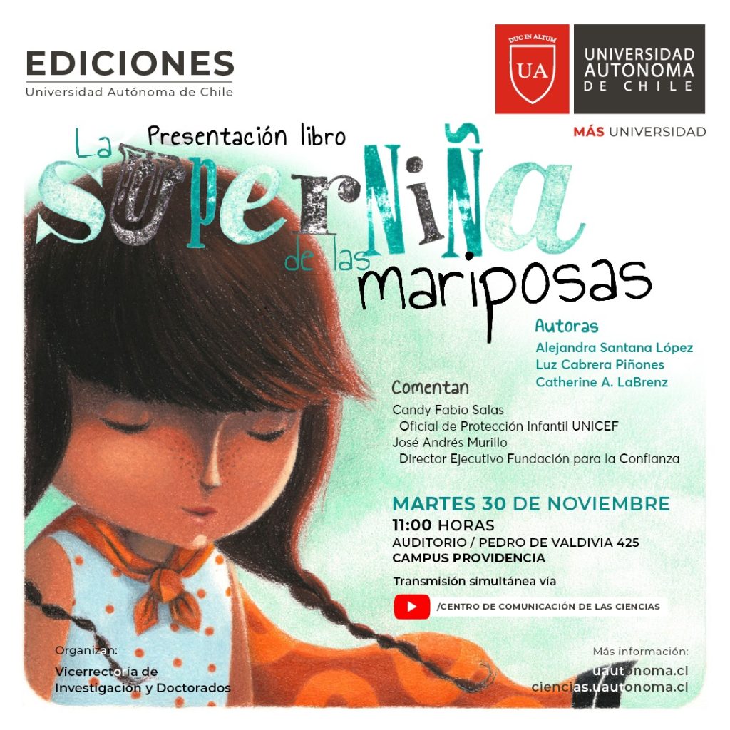“Buscamos que se visibilice a las niñas como personas con derechos y con muchas potencialidades en la vida”, comentó la vrisionaria. El cuento trae además un manual de apoyo para los adultos que acompañen en la lectura a los menores. Pueden descargarlo aquí. No se pierdan su lanzamiento este martes 30 de noviembre a las 11:00 horas, por el canal de Youtube del Centro de Comunicación de las Ciencias de la Universidad Autónoma de Chile. ¡Los esperamos!