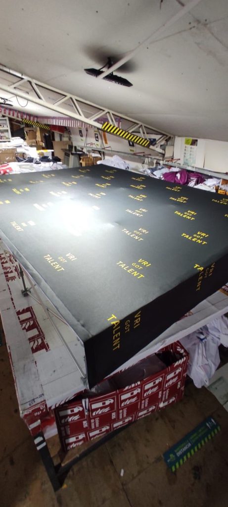 Y aunque no podemos adelantar mucha información para que todo sea sorpresa, aquí les mostramos el photowall con el diseño del VRI Got Talent, con fondo negro y letras doradas. Se trata de un pendón araña con una impresión en pvc que fue diseñado por nuestro FabLab. El mismo estará en la entrada y será un punto para que los asistentes se tomen fotos junto a sus equipos o amigos.