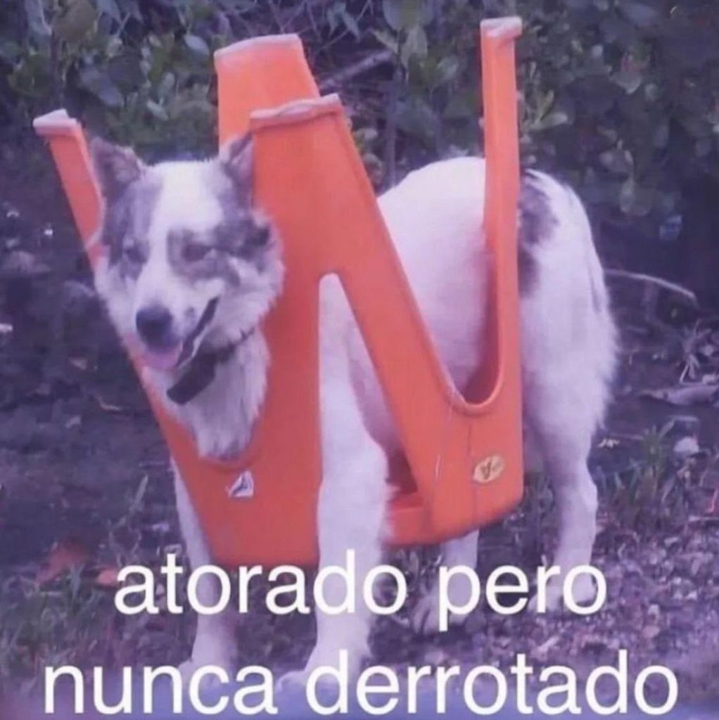 ¡Qué divertido! Amamos el lado lúdico y divertido de nuestro querido vrisionario, quien nos compartió esta imagen donde se puede ver a un perrito que trae un banco de plástico en el cuerpo. Y tal como dice la leyenda de la foto “atorado pero nunca derrotado” es como Guille termina su 2024 y se adelanta al próximo año.